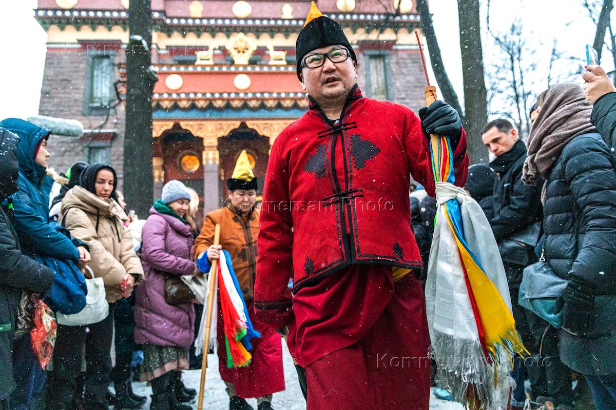 Хуралы и обряды в Петербургском Дацане Гунзэчойнэй по случаю наступления Сагаалгана - Буддийского Нового года по лунному календарю. Верующие у ритуальных костров на приводной территории Санкт-Петербургского Дацана Гунзэчойнэй на набережной реки Большая Невка.