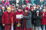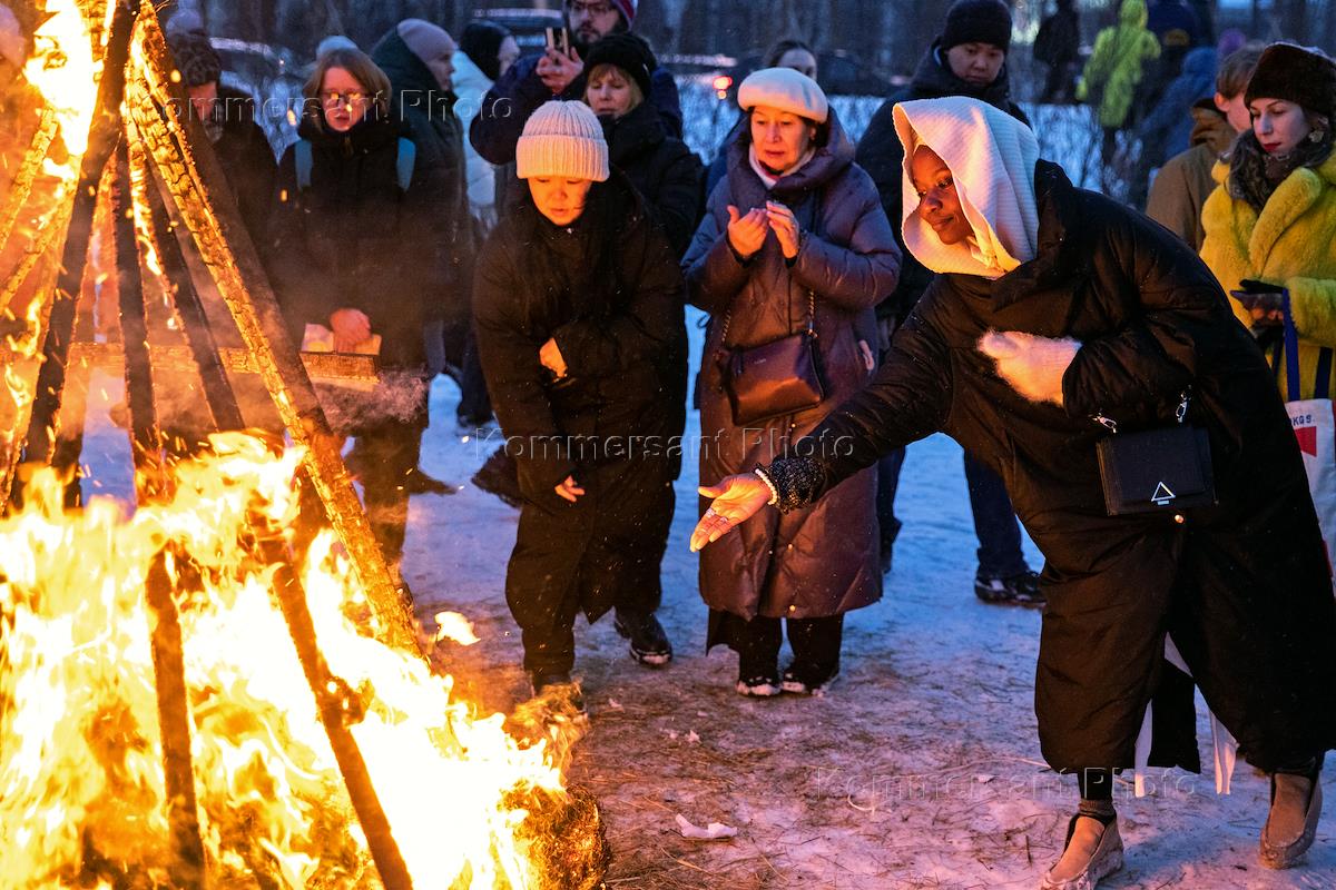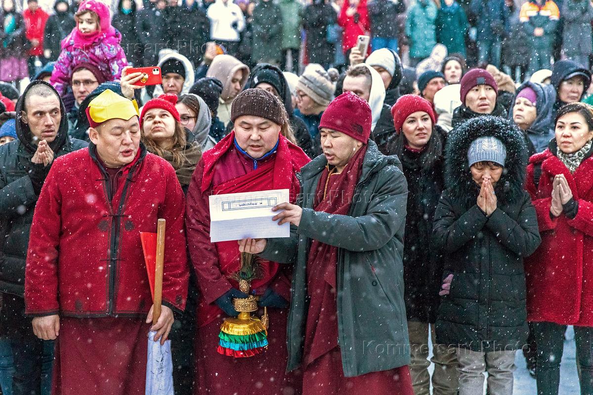 Хуралы и обряды в Петербургском Дацане Гунзэчойнэй по случаю наступления Сагаалгана - Буддийского Нового года по лунному календарю. Верующие у ритуальных костров на приводной территории Санкт-Петербургского Дацана Гунзэчойнэй на набережной реки Большая Невка.