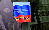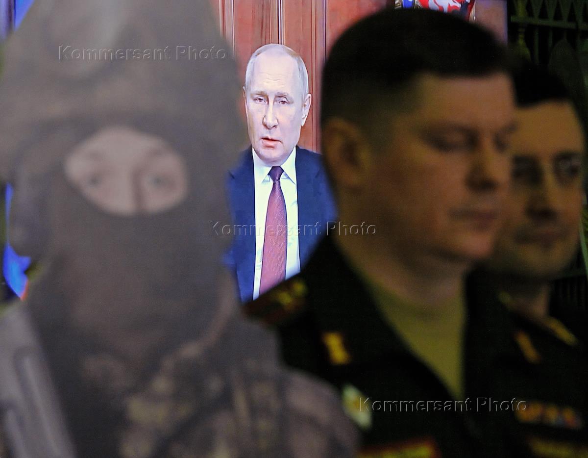 Церемония открытия выставки, посвященной специальной военной операции "Только вместе, только вперед!", в здании Военно-исторического музея артиллерии, инженерных войск и войск связи. Видеообращение президента России Владимира Путина о начале военной спецоперации на экране телевизора.