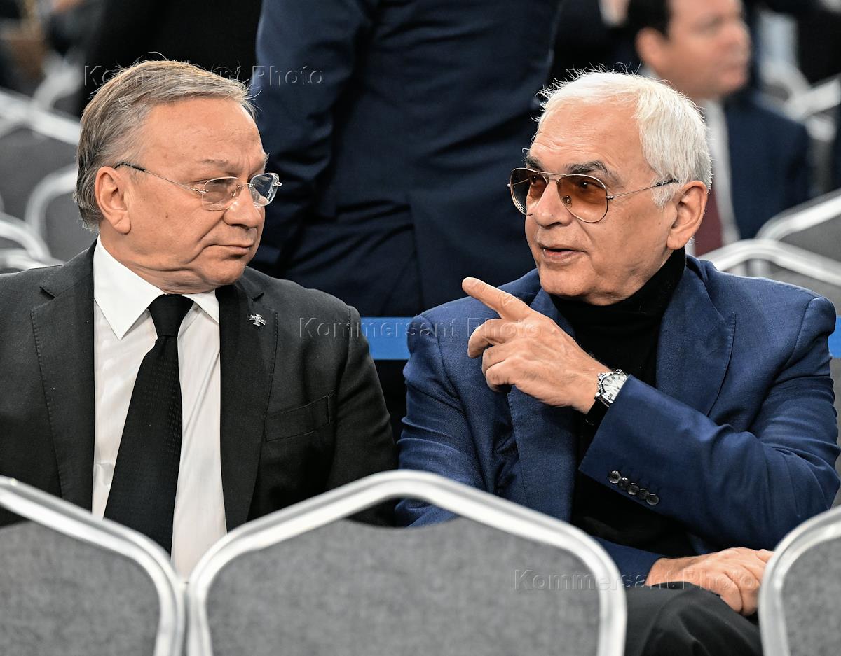 Церемония оглашения ежегодного Послания президента России Владимира Путина к Федеральному Собранию в Гостином дворе. Актер, продюсер Игорь Угольников (слева) и кинорежиссер, генеральный директор киноконцерна "Мосфильм" Карен Шахназаров (справа) перед началом церемонии.