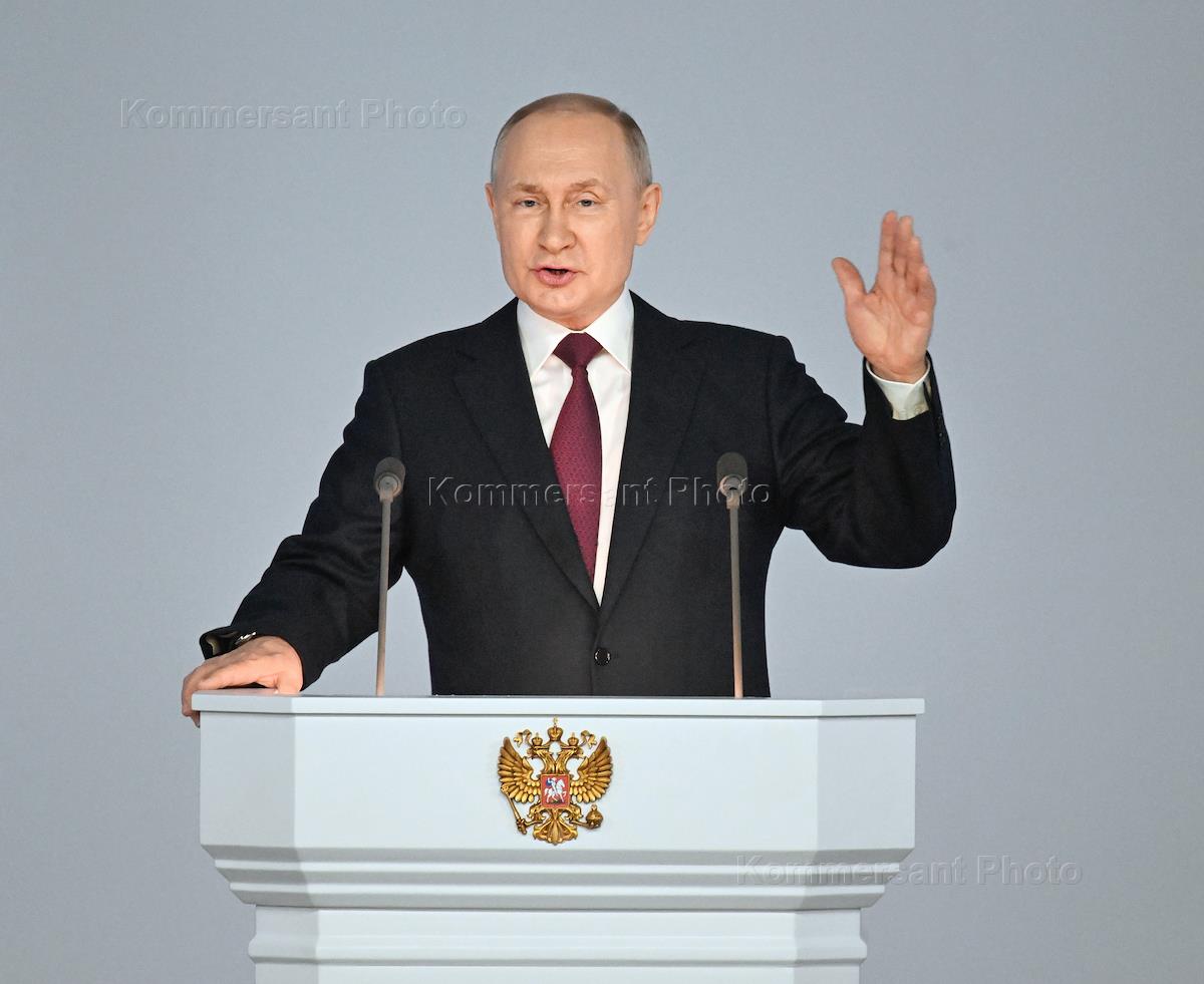 Церемония оглашения ежегодного Послания президента России Владимира Путина к Федеральному Собранию в Гостином дворе. Президент России Владимир Путин во время церемонии.