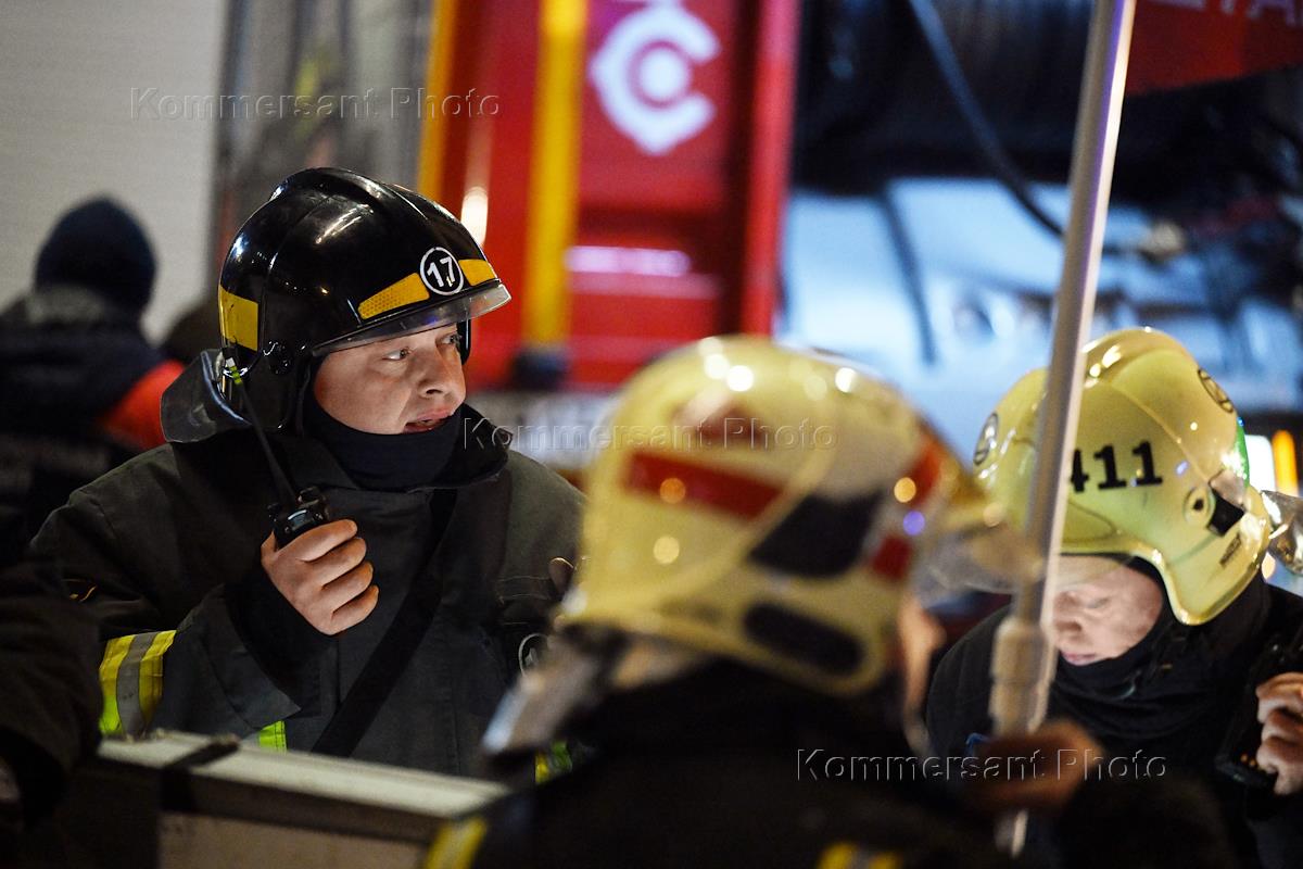 Пожар в здании бывшего общежития на улице Международная, первые этажи которого были переделаны под гостиницу МКМ. Сотрудники пожарной охраны МЧС России во время ликвидации пожара.