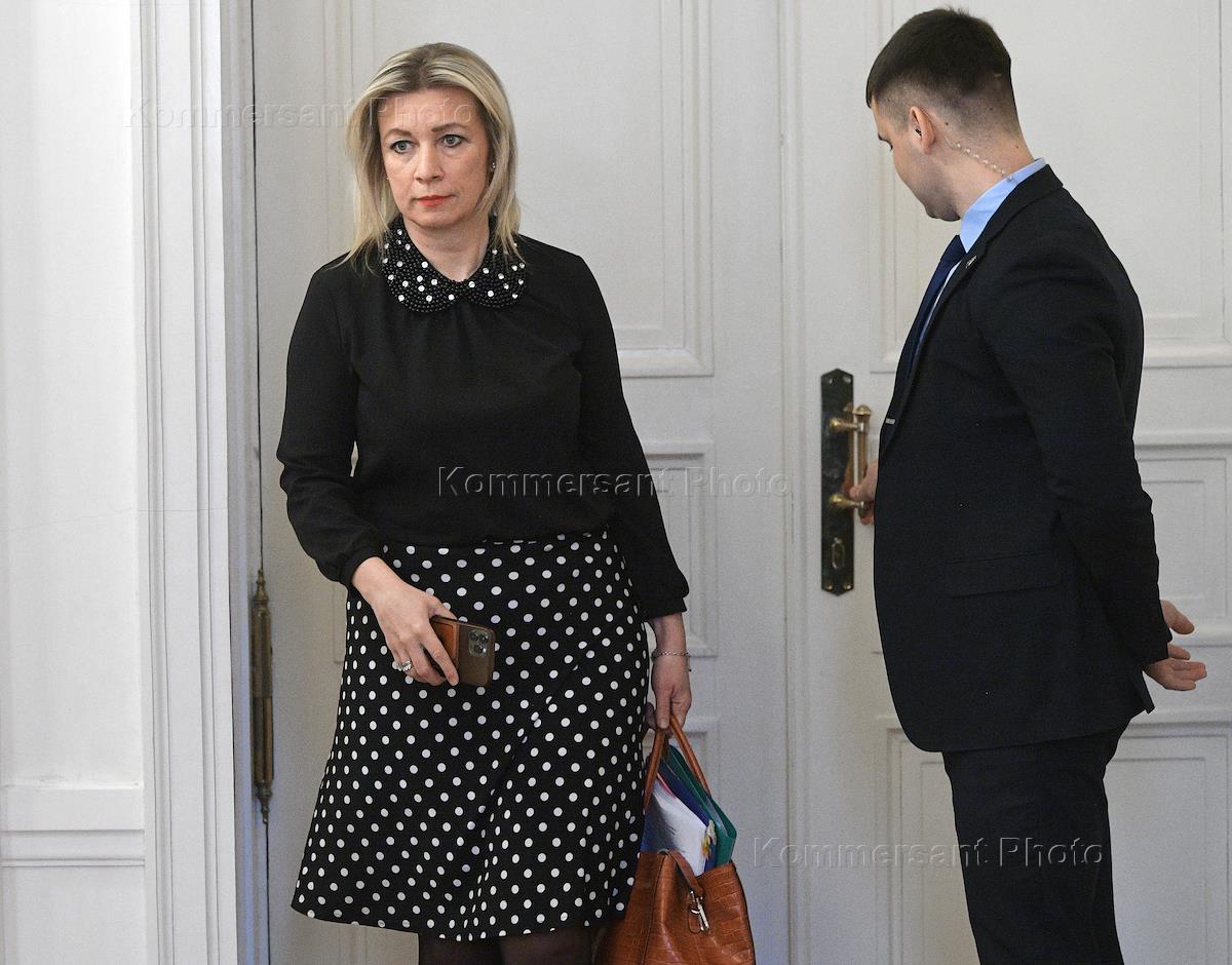 Переговоры министра иностранных дел России Сергея Лаврова и заведующего Канцелярией Комиссии ЦК КПК Ван И в Доме приемов МИД России. Директор Департамента информации и печати МИД России Мария Захарова перед началом переговоров.