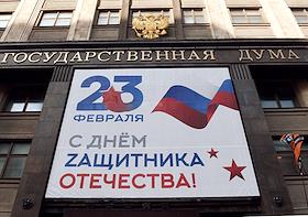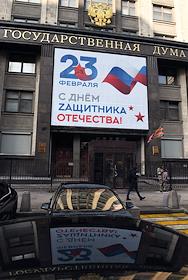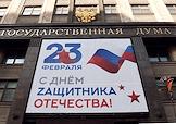 Пленарное заседание Государственной думы (ГД) России. Жанровая фотография. Поздравительный плакат ко Дню защитника Отечества на здании ГД России.
