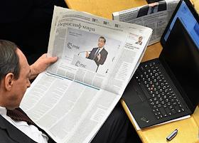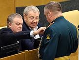 Пленарное заседание Государственной думы (ГД) России. Член комитета ГД России по бюджету и налогам Виктор Селиверстов (слева) перед началом заседания.
