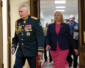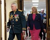 Пленарное заседание Государственной думы (ГД) России. Председатель комитета ГД России по обороне Андрей Картаполов (слева) перед началом заседания.