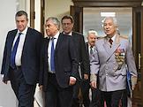 Пленарное заседание Государственной думы (ГД) России. Слева направо: член комитета ГД России по государственному строительству и законодательству Николай Брыкин, член комитета ГД России по строительству и жилищно-коммунальному хозяйству Виталий Бахметьев и член комитета ГД России по обороне Андрей Гурулев перед началом заседания.