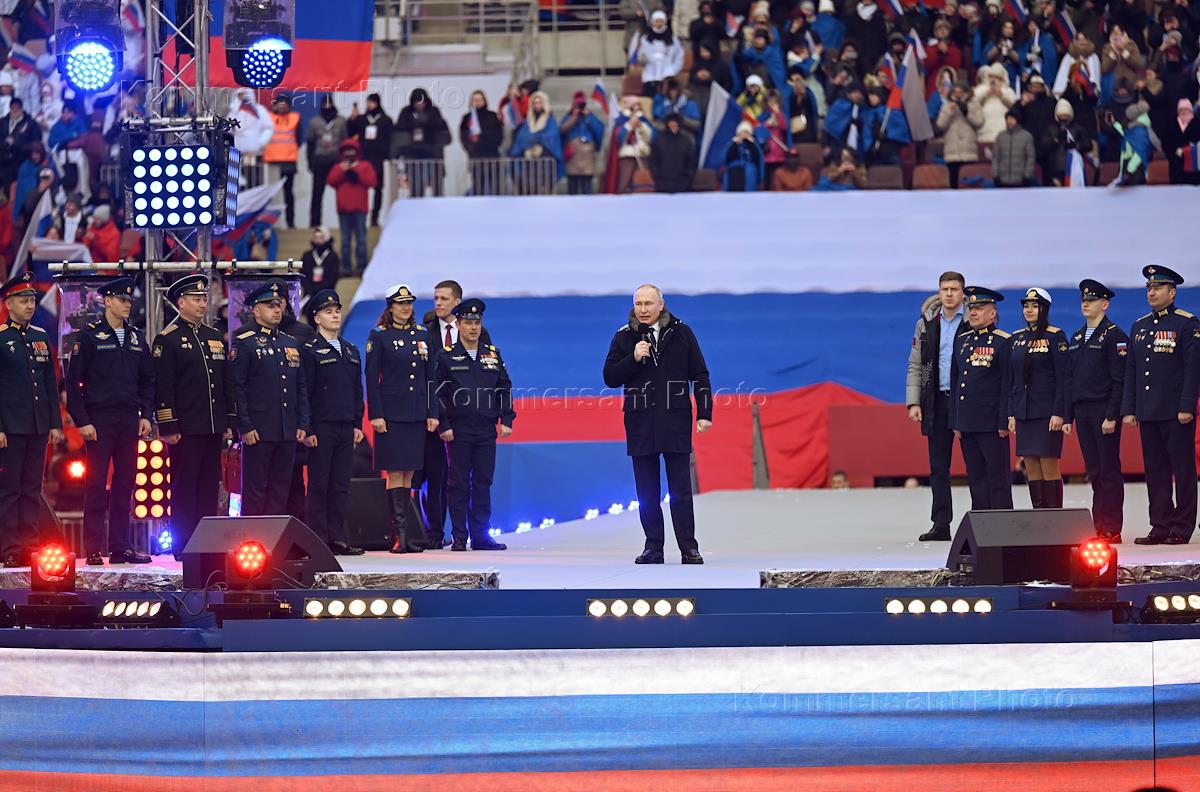 Митинг-концерт, посвященный Дню защитника Отечества, на стадионе "Лужники". Президент России Владимир Путин (слева) во время митинга-концерта.