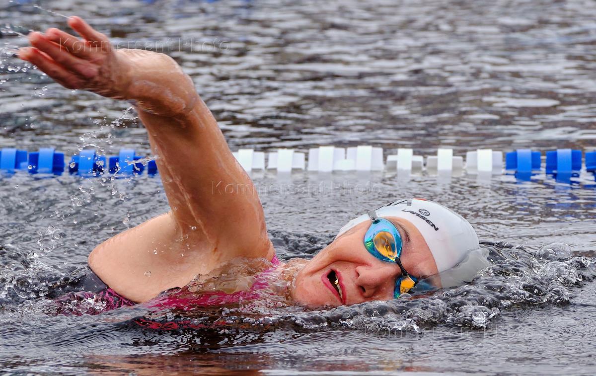 Соревнования по зимнему плаванию "Кубок Большой Невы 2023" на Гребном канале Крестовского острова. Участница соревнований во время заплыва.