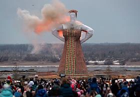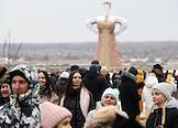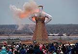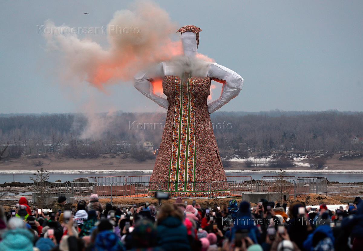 "Широкая Масленица 2023". Празднование Масленицы в Волгограде. Жанровая фотография. Масленичные гуляния в Центральном парке культуры и отдыха (ЦПКиО). Сжигание чучела Масленицы.