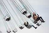 "Широкая Масленица 2023". Празднование Масленицы в Волгограде. Жанровая фотография. Масленичные гуляния в Центральном парке культуры и отдыха (ЦПКиО). Девушки во время катания на карусели.