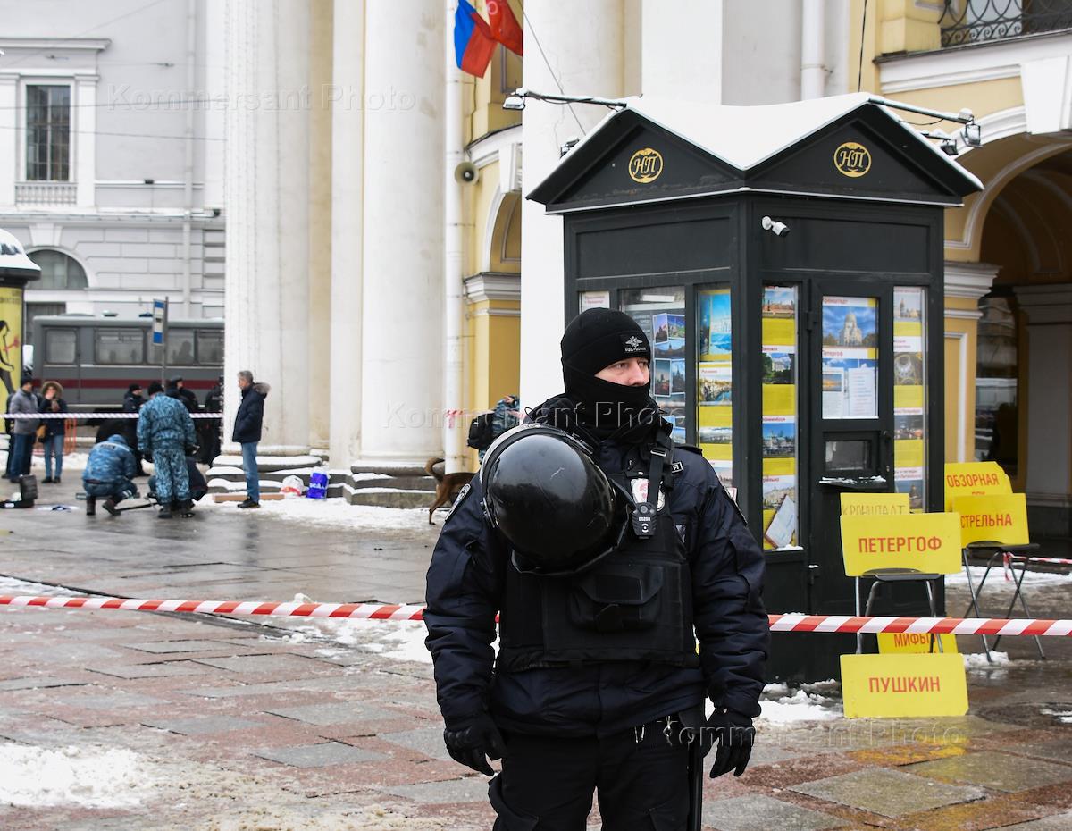 Ситуация возле станции метро "Гостиный двор", где произошла стрельба. Сотрудник ОМОН у заградительной ленты возле входа на станцию.