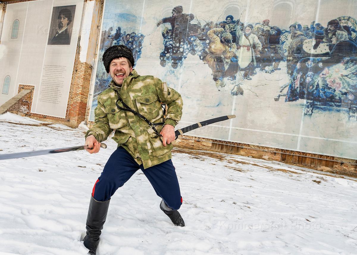 Празднование "Широкой Масленицы" в селе Сухобузимо Красноярского края. Жанровая фотография. Казак с шашкой на фоне плаката с картиной Василия Сурикова "Взятие снежного городка".