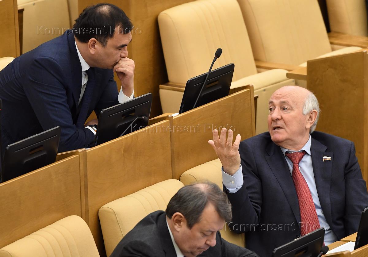 Пленарное заседание Государственной думы (ГД) России. Член комитета ГД России по промышленности и торговле Евгений Нифантьев (слева) и член комитета ГД России по строительству и жилищно-коммунальному хозяйству Александр Якубовский (справа) во время заседания.
