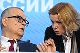 Ежегодная встреча кредитных организаций с руководством Банка России на площадке СберУниверситета. Президент Ассоциации банков России Георгий Лунтовский (слева) и первый заместитель председателя Центрального банка России Ольга Скоробогатова (справа) во время встречи.