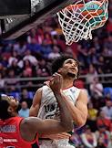 Единая лига ВТБ 2022/2023. Матч по баскетболу между командами ЦСКА (Москва) - УНИКС (Казань) на стадионе "Мегаспорт". Игрок команды ЦСКА Ливио Жан-Шарль (слева) и игрок команды УНИКС Луи Лабери (справа) во время матча.