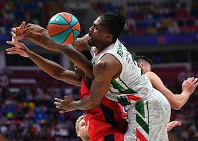 Единая лига ВТБ 2022/2023. Матч по баскетболу между командами ЦСКА (Москва) - УНИКС (Казань) на стадионе "Мегаспорт". Игрок команды УНИКС Луи Лабери (в центре) во время матча.