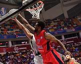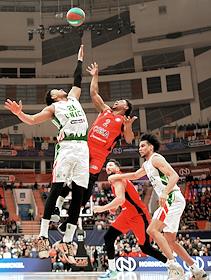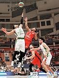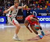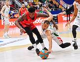 Единая лига ВТБ 2022/2023. Матч по баскетболу между командами ЦСКА (Москва) - УНИКС (Казань) на стадионе "Мегаспорт". Игрок команды ЦСКА Ливио Жан-Шарль (слева) и игрок команды УНИКС Луи Лабери (справа) во время матча.