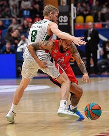 Единая лига ВТБ 2022/2023. Матч по баскетболу между командами ЦСКА (Москва) - УНИКС (Казань) на стадионе "Мегаспорт". Игрок команды ЦСКА Каспер Уэйр (справа) во время матча.