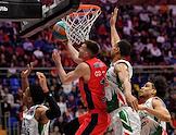 Единая лига ВТБ 2022/2023. Матч по баскетболу между командами ЦСКА (Москва) - УНИКС (Казань) на стадионе "Мегаспорт". Игрок команды ЦСКА Каспер Уэйр (второй справа) и игрок команды УНИКС Ненад Димитриевич (второй слева) во время матча.