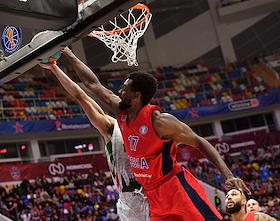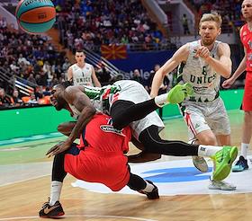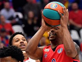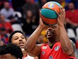 Единая лига ВТБ 2022/2023. Матч по баскетболу между командами ЦСКА (Москва) - УНИКС (Казань) на стадионе "Мегаспорт". Игрок команды УНИКС Луи Лабери (в центре) во время матча.