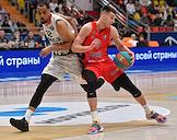 Единая лига ВТБ 2022/2023. Матч по баскетболу между командами ЦСКА (Москва) - УНИКС (Казань) на стадионе "Мегаспорт". Игрок команды УНИКС Ненад Дмитриевич (слева) и игрок команды ЦСКА Каспер Уэйр (справа) во время матча.