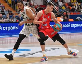 Единая лига ВТБ 2022/2023. Матч по баскетболу между командами ЦСКА (Москва) - УНИКС (Казань) на стадионе "Мегаспорт". Игрок команды ЦСКА Самсон Руженцев (в центре) во время матча.