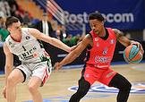 Единая лига ВТБ 2022/2023. Матч по баскетболу между командами ЦСКА (Москва) - УНИКС (Казань) на стадионе "Мегаспорт". Игрок команды УНИКС Игрок команды УНИКС Джален Рейнольдс (справа) во время матча.
