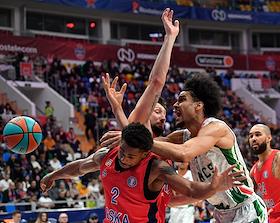 Единая лига ВТБ 2022/2023. Матч по баскетболу между командами ЦСКА (Москва) - УНИКС (Казань) на стадионе "Мегаспорт". Слева направо: игроки команды ЦСКА Каспер Уэйр, Никита Курбанов и игрок команды УНИКС Луи Лабери во время матча.