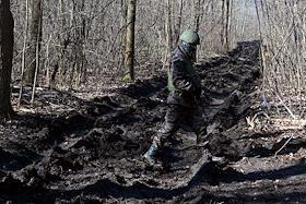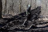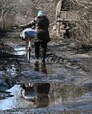 Ситуация в Донецкой Народной Республике (ДНР) во время проведения специальной военной операции Вооруженных Сил России. Жанровая фотография. Мирная жительница идет по проселочной дороге с велосипедом.