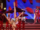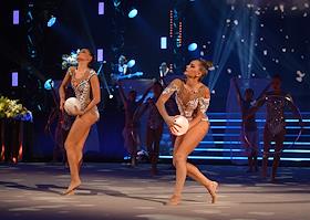 Гала-шоу Чемпионата России по художественной гимнастике во Дворце гимнастики Ирины Винер-Усмановой. Гимнастки Арина и Дина Аверины во время выступления на гала-шоу.