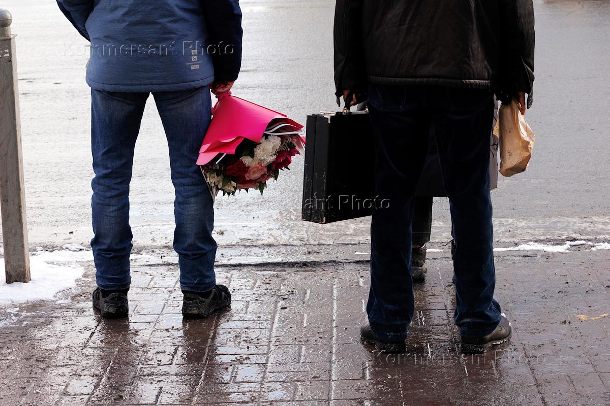 Екатеринбург накануне Международного женского дня (8 марта). Жанровая фотография. Мужчины с букетом цветов и бутылкой с алкоголем в пакете на пешеходном переходе.
