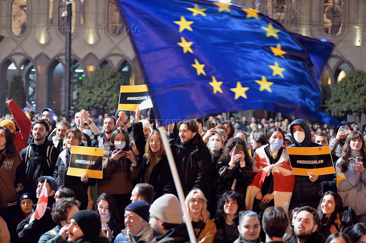 Акция протеста против принятия парламентом Грузии закона об иноагентах. Участники во время акции у здания парламента.