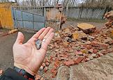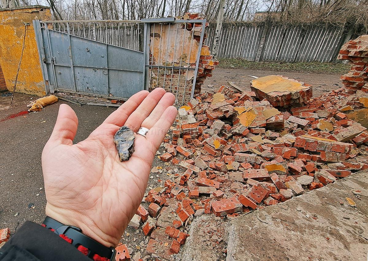 Ситуация в Донецке во время проведения специальной военной операции Вооруженных Сил России. Последствия обстрела Куйбышевского района. Кусок от снаряда в руке человека.