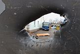 Ситуация в Донецке во время проведения специальной военной операции Вооруженных Сил России. Последствия обстрела Куйбышевского района. Дыра от снаряда в металле.