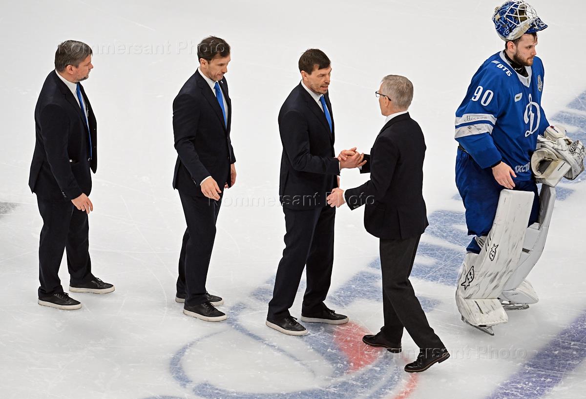Континентальная хоккейная лига (КХЛ). Чемпионат сезона 2022/23. Матч между командами "Динамо" (Москва) - "Торпедо" (Нижегородская область) на стадионе "ВТБ Арена". Справа налево: вратарь команды "Динамо" Константин Волков, главный тренер команды "Торпедо" Игорь Ларионов и главный тренер команды "Динамо" Алексей Кудашов после матча.