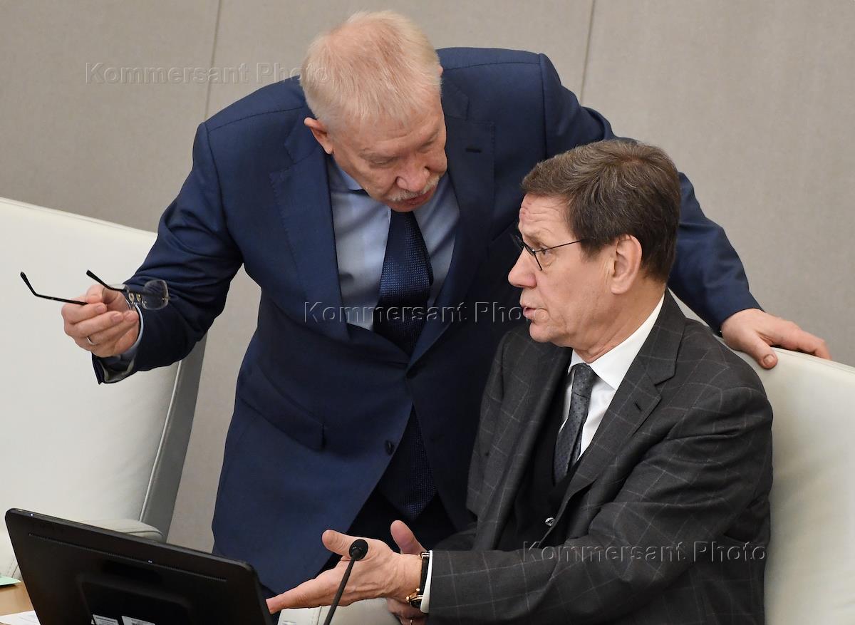 Пленарное заседание Государственной думы (ГД) России. Председатель комитета ГД России по контролю Олег Морозов (слева) и заместитель председателя комитета ГД России по экологии и охране окружающей среды Анатолий Грешневиков (справа) во время заседания.