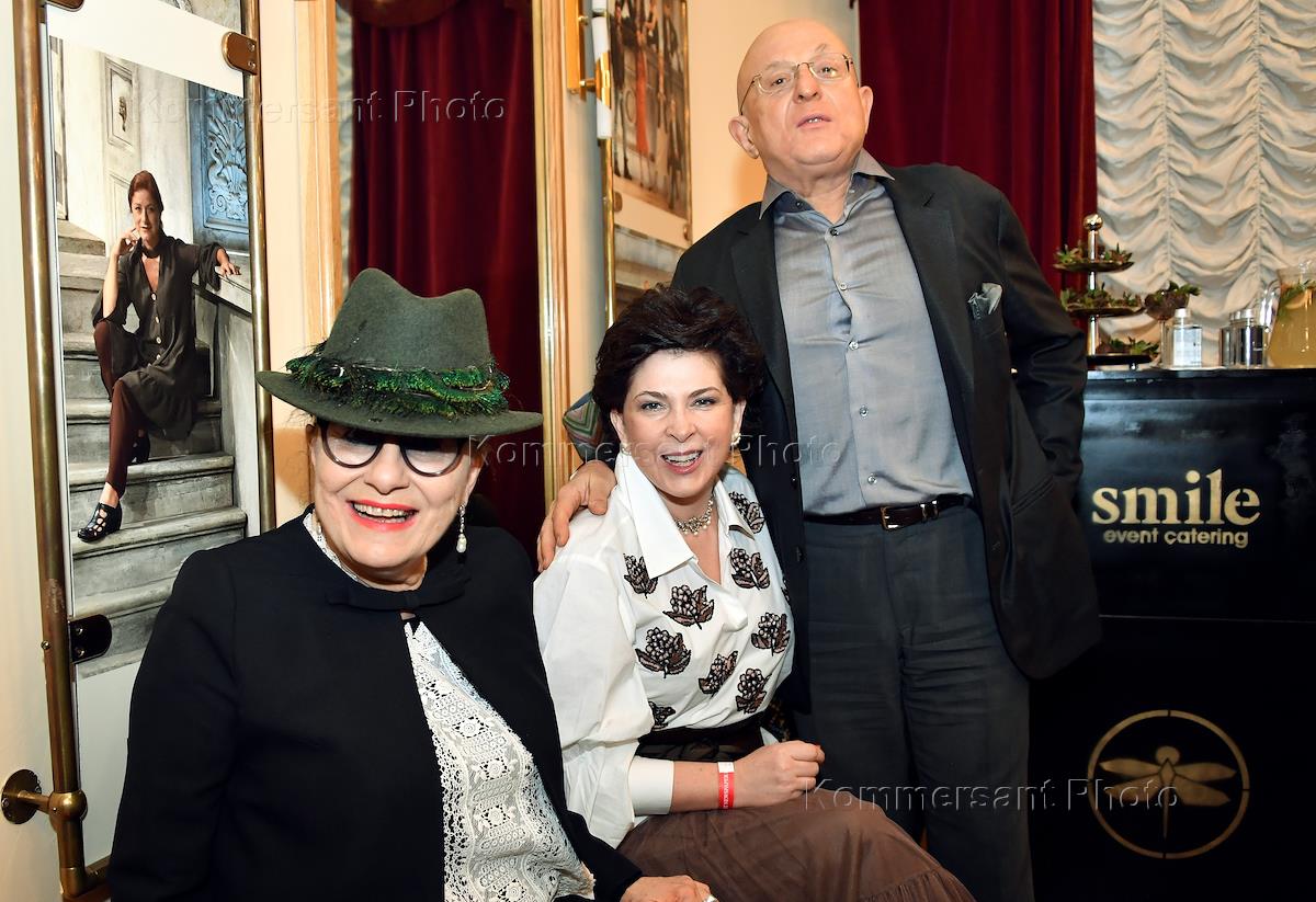 Церемония вручения XI ежегодной премии The Art Newspaper Russia в Московском драматическом театре имени А.С.Пушкина. Слева направо: президент Федерации еврейских общин России (ФЕОР), генеральный директор Еврейского музея и центра толерантности Александр Борода, исполнительный директор Еврейского музея и Центра Толерантности Кристина Краснянская и журналист Мария Федорова перед началом церемонии.