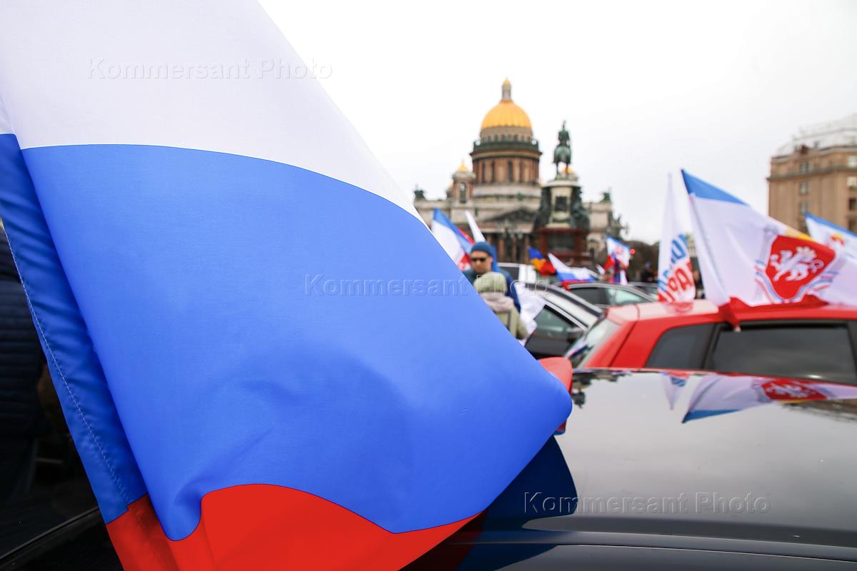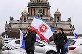 Автопробег в честь девятой годовщины воссоединения Крыма и Севастополя с Россией. Участники автопробега на Исаакиевской площади.