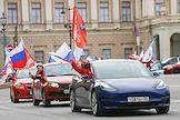 Автопробег в честь девятой годовщины воссоединения Крыма и Севастополя с Россией. Участники автопробега перед стартом у здания Законодательного собрания Санкт-Петербурга.