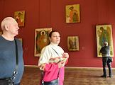 Праздничные мероприятия в Михайловском дворце в честь 125-летия со дня своего открытия Русского музея. Жанровая фотография. Сотрудница музея и посетительница в одном из залов музея.