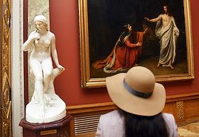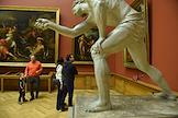 Праздничные мероприятия в Михайловском дворце в честь 125-летия со дня своего открытия Русского музея. Жанровая фотография. Посетители в одном из залов музея. Картина Карла Брюллова "Последний день Помпеи".