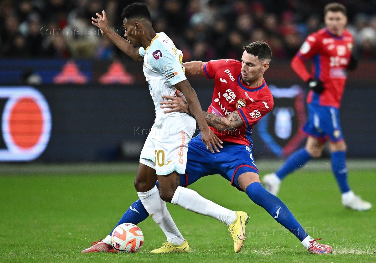 Российская Премьер-Лига (РПЛ). МИР - Чемпионат России по футболу 2022/2023. 20-й тур. Матч между командами ЦСКА (Москва) - "Зенит" (Санкт-Петербург) на стадионе "ВЭБ Арена". Игрок команды ЦСКА Саша Зделар (справа) и игрок команды "Зенит" Матео Кассьерра (слева) во время матча.