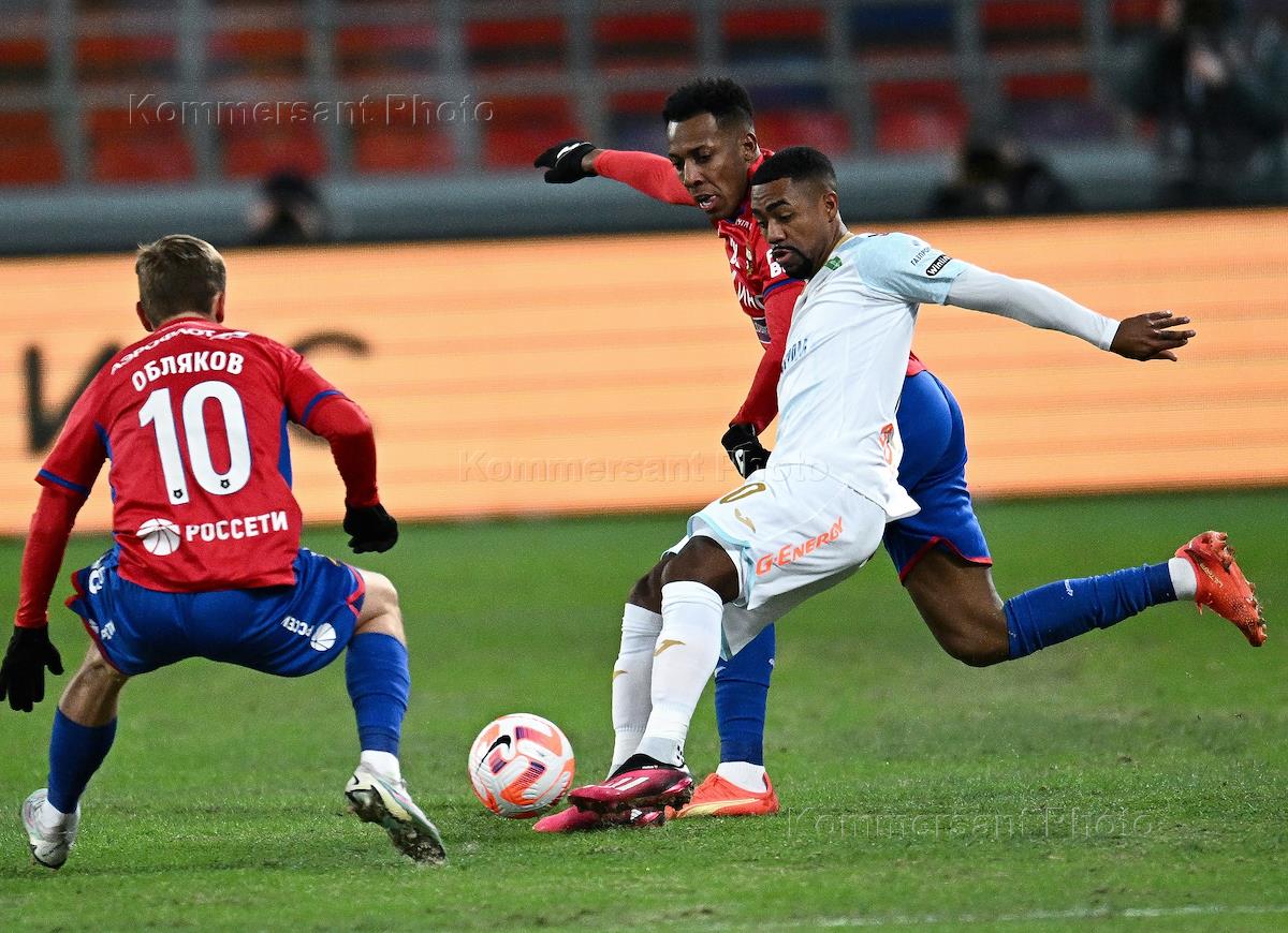 Российская Премьер-Лига (РПЛ). МИР - Чемпионат России по футболу 2022/2023. 20-й тур. Матч между командами ЦСКА (Москва) - "Зенит" (Санкт-Петербург) на стадионе "ВЭБ Арена". Игрок команды ЦСКА Мойзес (в центре) во время матча.
