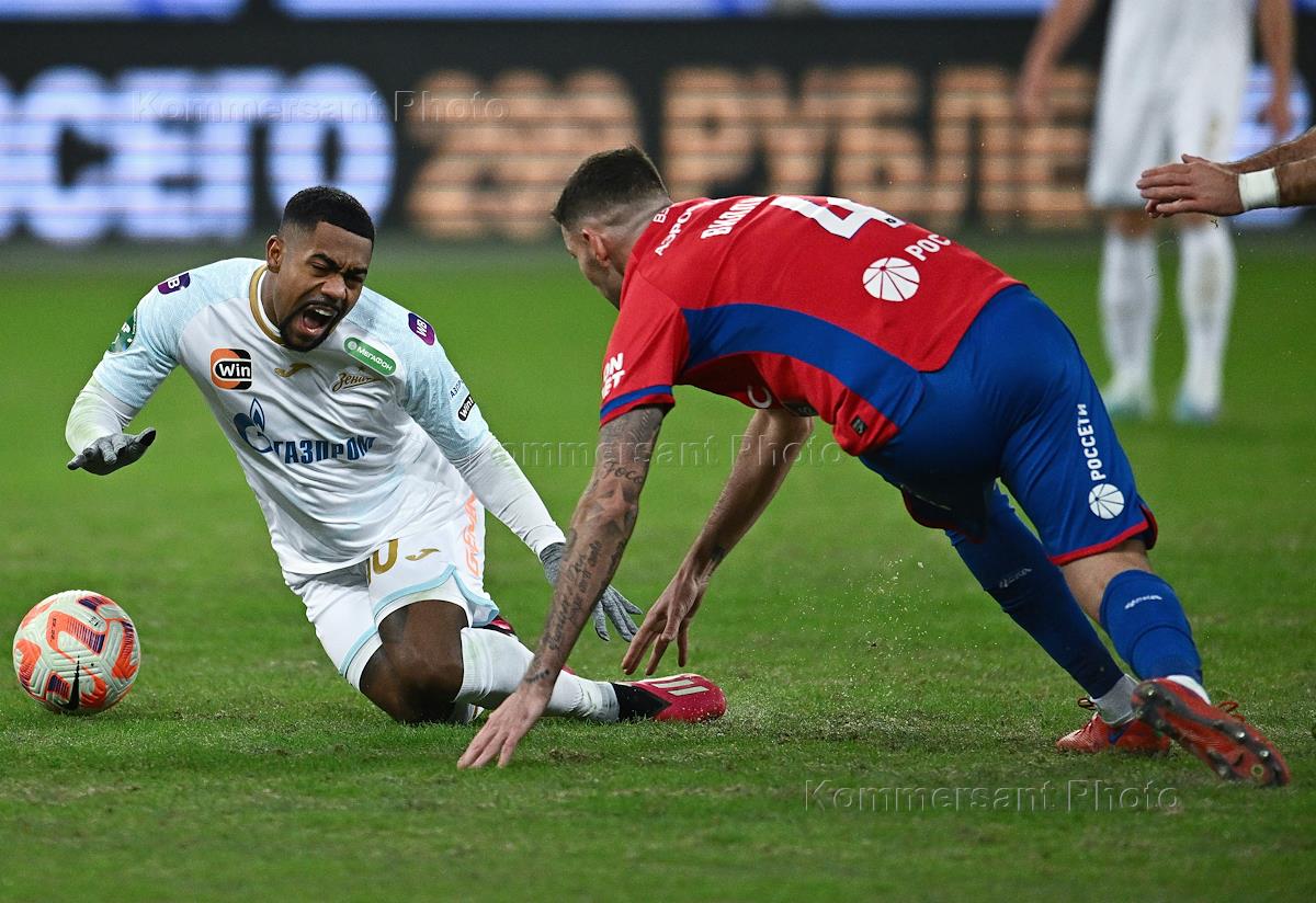 Российская Премьер-Лига (РПЛ). МИР - Чемпионат России по футболу 2022/2023. 20-й тур. Матч между командами ЦСКА (Москва) - "Зенит" (Санкт-Петербург) на стадионе "ВЭБ Арена". Игрок команды ЦСКА Виллиан Роша (справа) и игрок команды "Зенит" Малком (слева) во время матча.