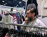 Выставка-ярмарка народных художественных промыслов и ремесел "Ладья" в Центральном выставочном комплексе (ЦВК) "Экспоцентр". Жанровая фотография. Мужчина-портной у вешалки с мужскими льняными рубашками.