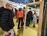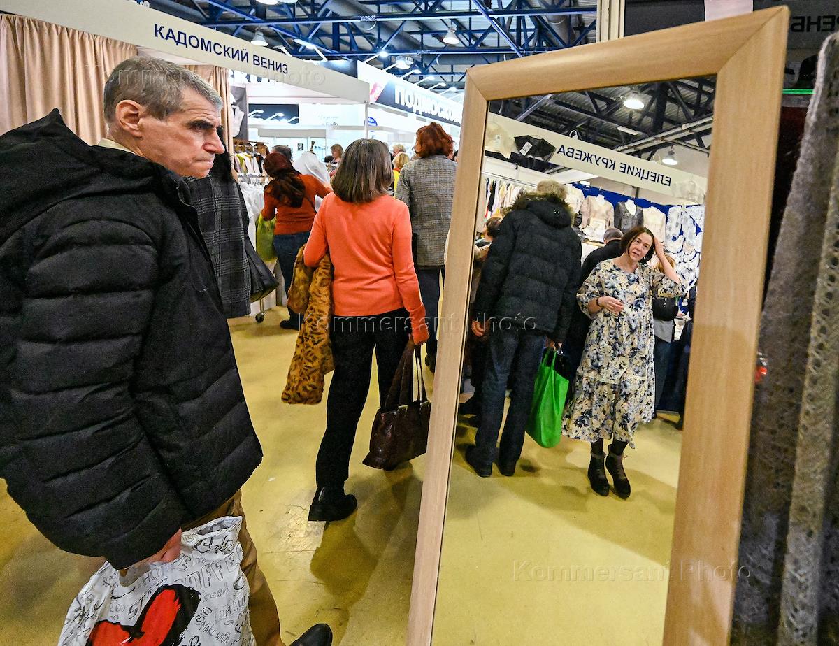 Выставка-ярмарка народных художественных промыслов и ремесел "Ладья" в Центральном выставочном комплексе (ЦВК) "Экспоцентр". Жанровая фотография. Посетители на выставке-ярмарке.
