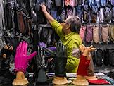 Выставка-ярмарка народных художественных промыслов и ремесел "Ладья" в Центральном выставочном комплексе (ЦВК) "Экспоцентр". Жанровая фотография. Продавец перчаток и его товар.