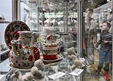 Выставка-ярмарка народных художественных промыслов и ремесел "Ладья" в Центральном выставочном комплексе (ЦВК) "Экспоцентр". Жанровая фотография. Фарфоровый сервиз в витрине и посетители выставки.