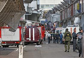 Сотрудник пожарной службы на месте взрыва рынка "Евразия" - часть Черкизовского рынка, который расположен по адресу Сиреневый бульвар, дом 2. Взрыв произошел в 10.35 утра, сработало безоболочное взрывное устройство, погибли десять человек, среди них двое детей, 31 человек доставлен в больницу. В результате взрыва обрушились конструкции на площади 200 квадратных метров. Возбуждено уголовное дело по статье убийство.